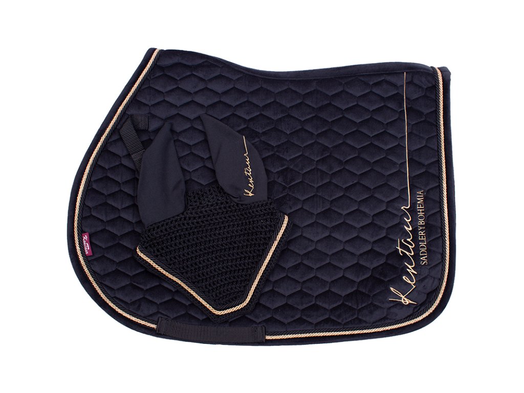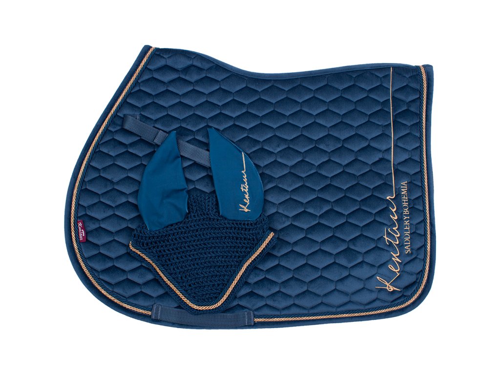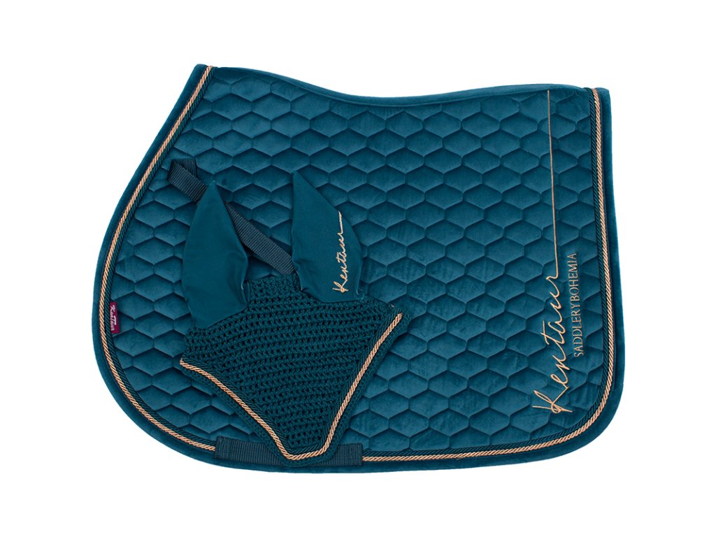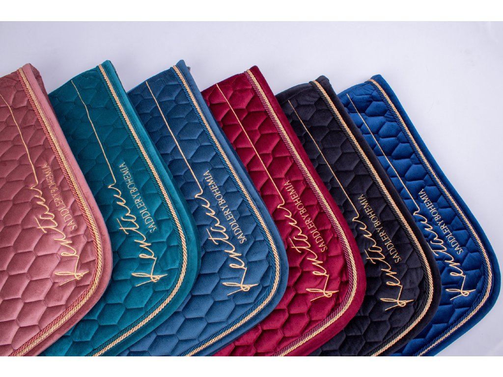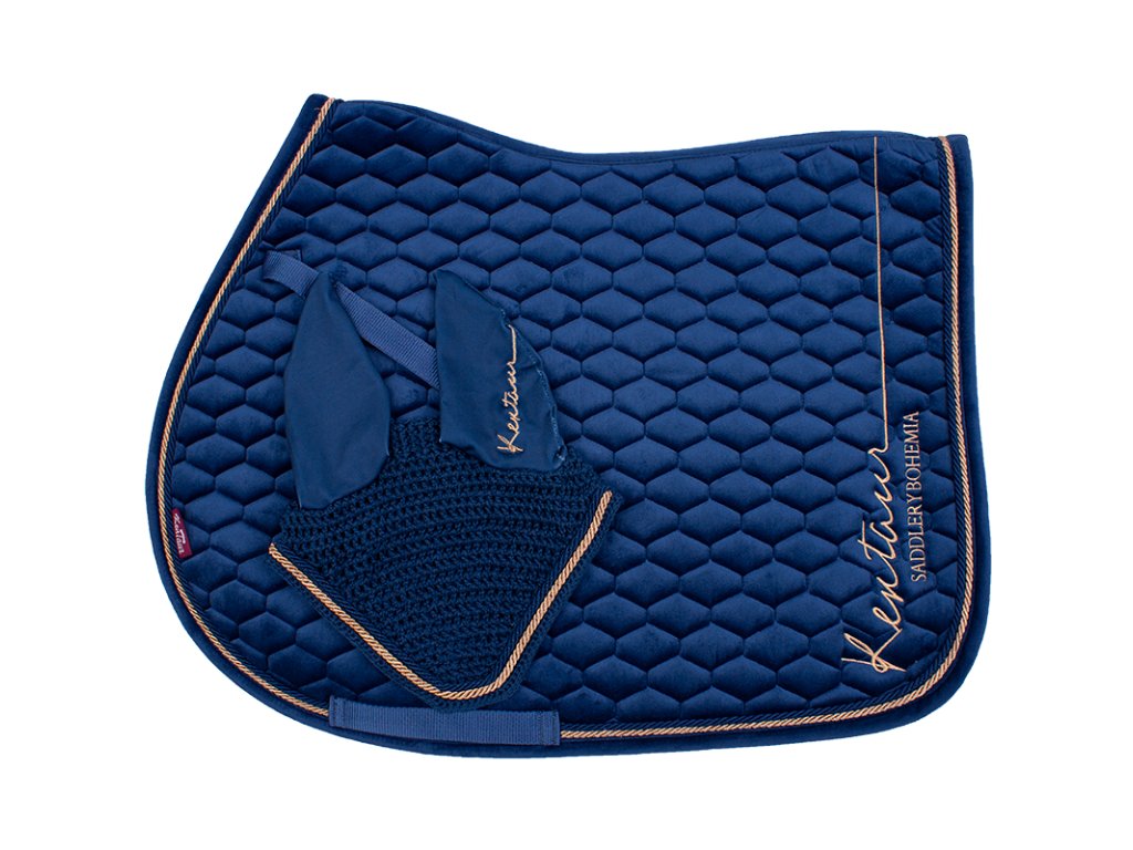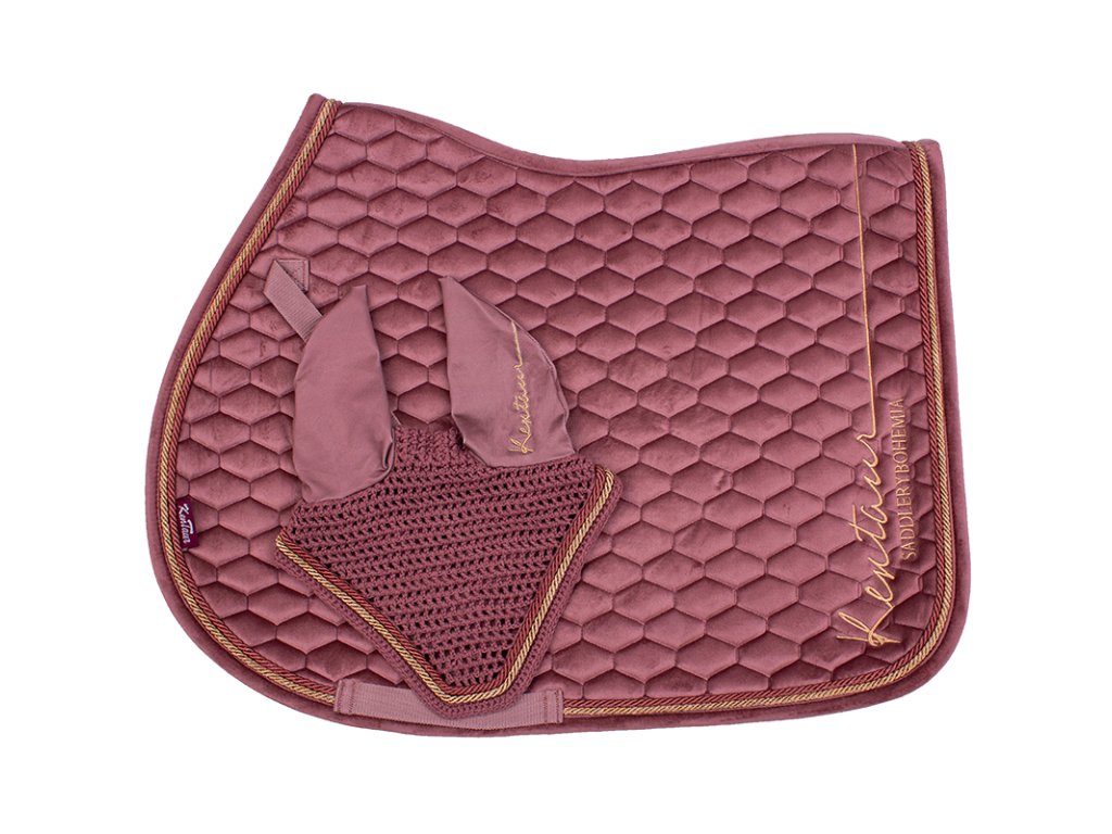 Sametová podsedlová dečka s novým vzorem prošívání v sadě s náušníky. Ozdobná kroucená šňůra a výšivka v barvě rosegold. Spodní strana z rychleschnoucí HI-TECH síťoviny.