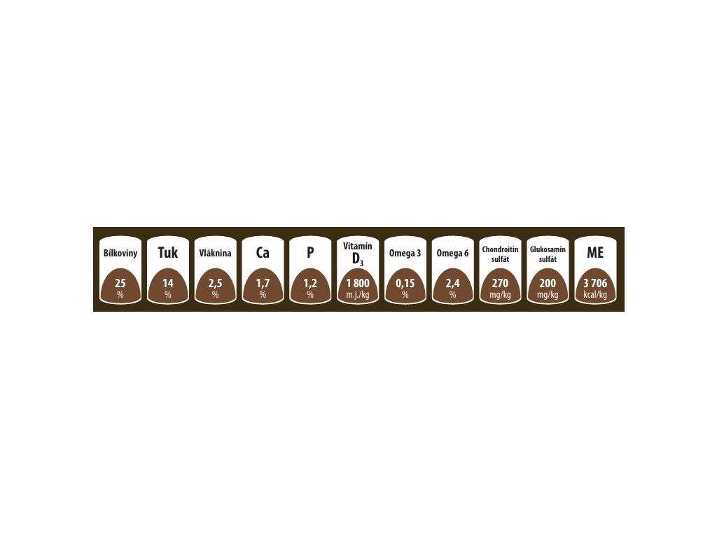 2,5 %, vápník 1,70 %, fosfor 1,20 %, omega 6 mastné kyseliny 2,4 %, omega 3 mastné kyseliny