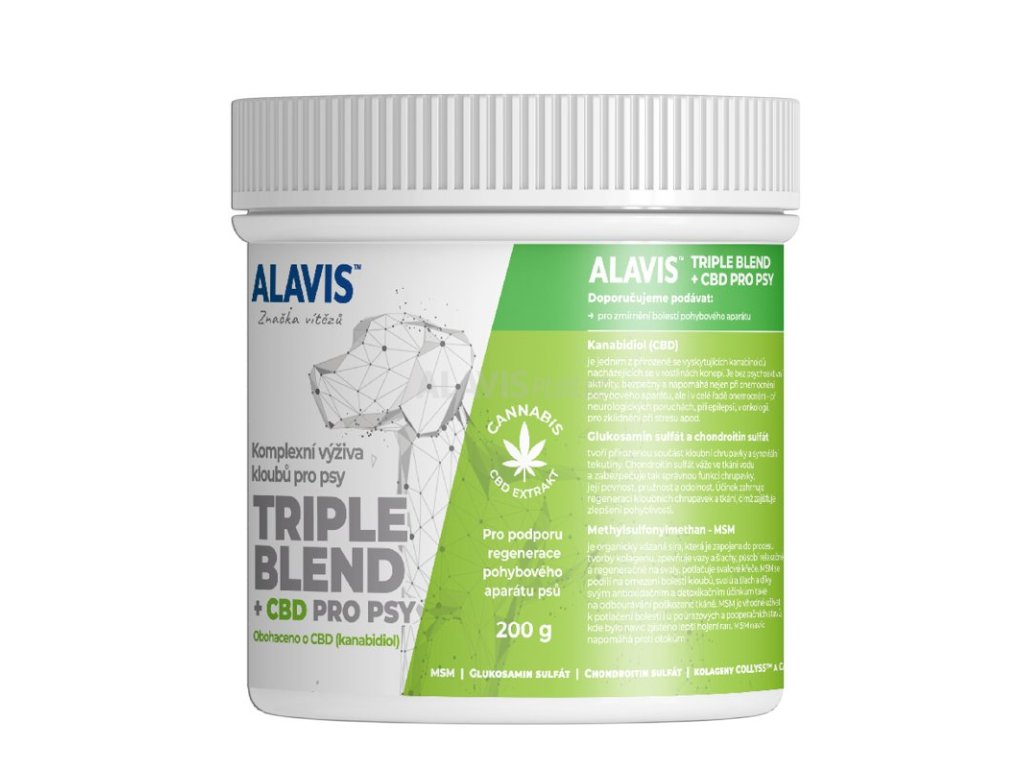 ALAVIS™ Triple Blend + CBD pro psy obsahuje látku CBD (kanabidiol) spolu s kombinací chondroprotektivních látek (glukosamin sulfátu a chondroitin sulfátu), látky MSM a značkových kolagenů a COLLYSS™ a CARTIDYSS™.
