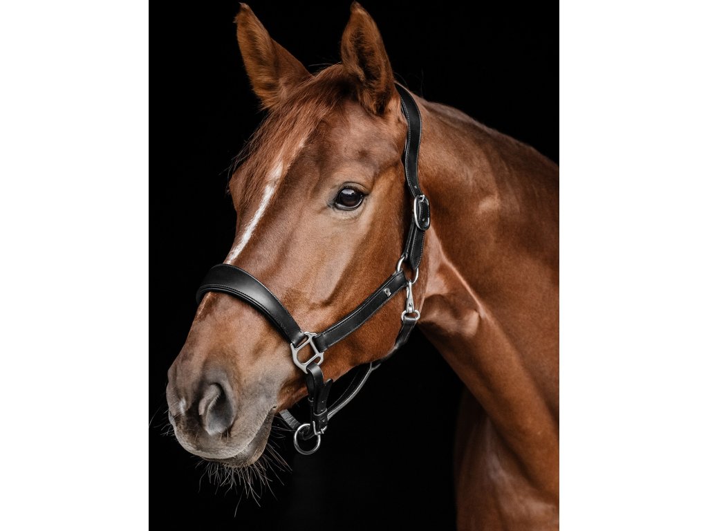 Elegantní kožená ohlávka s anatomicky tvarovanou čelenkou, nastavitelná na obou stranách. Měkce polstrovaná páska na nos a nátylník. Vysoce kvalitní kování. Snadno nastavitelný pásek pod bradu.