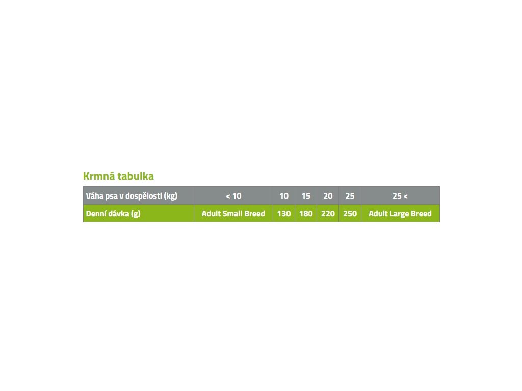 Doporučený denní příjem krmiva uvedený v krmné tabulce rozdělte během dne na 1-2 stejné porce.