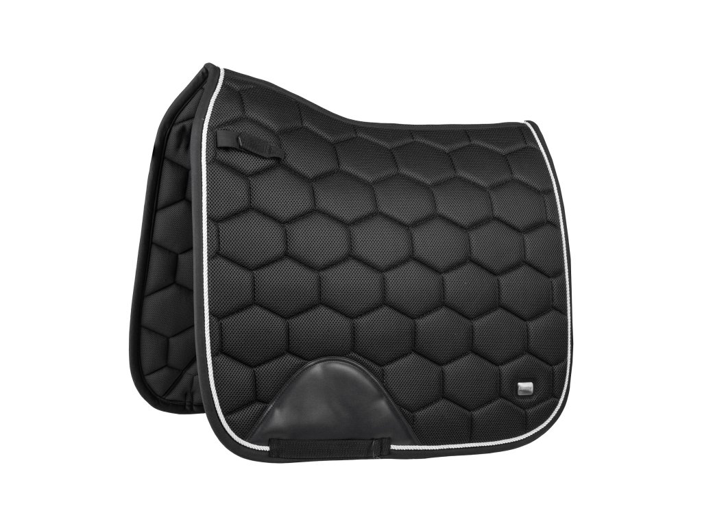 Elegantní a prodyšná podsedlová dečka z mesh materiálu s bílými perleťovými akcenty a vysokým kohoutkem pro pohodlné padnutí. PU zesílení u podbřišní pásky a elastické uchycení přes D-kroužek zajišťují funkční design.