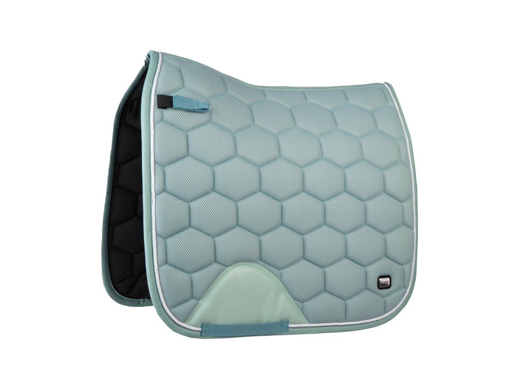 Elegantní a prodyšná podsedlová dečka z mesh materiálu s bílými perleťovými akcenty a vysokým kohoutkem pro pohodlné padnutí. PU zesílení u podbřišní pásky a elastické uchycení přes D-kroužek zajišťují funkční design.