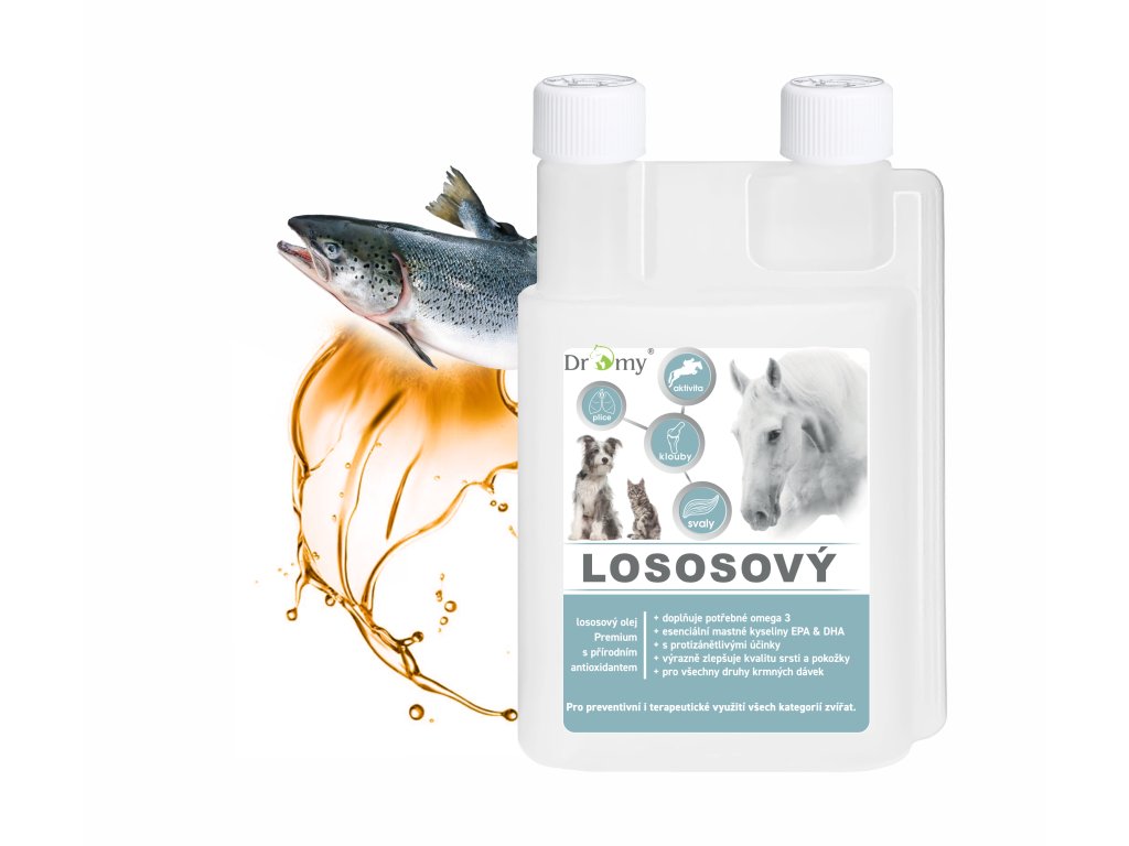 Lososový olej Premium, je přírodním zdrojem nenasycených mastných kyselin, které jsou z nutričního hlediska pro psy a kočky základním materiálem pro tvorbu a funkci buněčných membrán. Jsou zcela nepostradatelné pro transportní mechanismy a funkce enzymatických systémů. Esenciální mastné kyseliny DHA (kyselina dokosahexaenová) a EPA (kyselina eikosapentaenová) jsou nejvýznamnější složkou oleje. Tyto kyseliny si organismus nevytváří sám a jejich příjem do organismu je zcela závislý na dietě. Příznivě ovlivňují kardiovaskulární, svalový, nervový, respirační, imunitní i trávicí systém. Nedostatek esenciálních mastných kyselin se může projevit snížením obranyschopnosti organismu, únavou, změnou stavu pokožky, únavou, poruchou růstu i reprodukce. Játra jsou hlavním místem regulace činnosti při látkové výměně. Prostřednictvím fosfolipidů se podílejí na tvorbě lipoproteinů, které hrají podstatnou roli při transportu tuků.