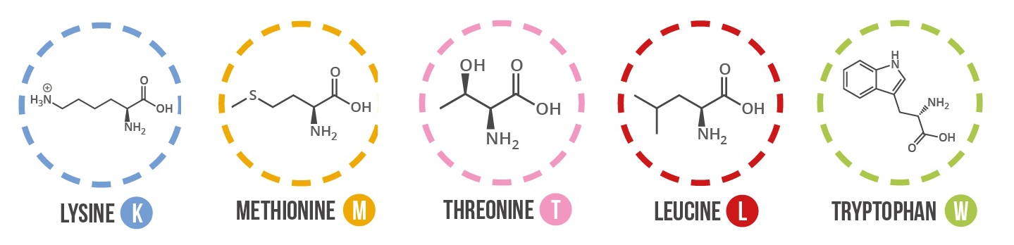 lysin, methionin, threonin, leucin, tryptofan a doplňuje karnitin.
