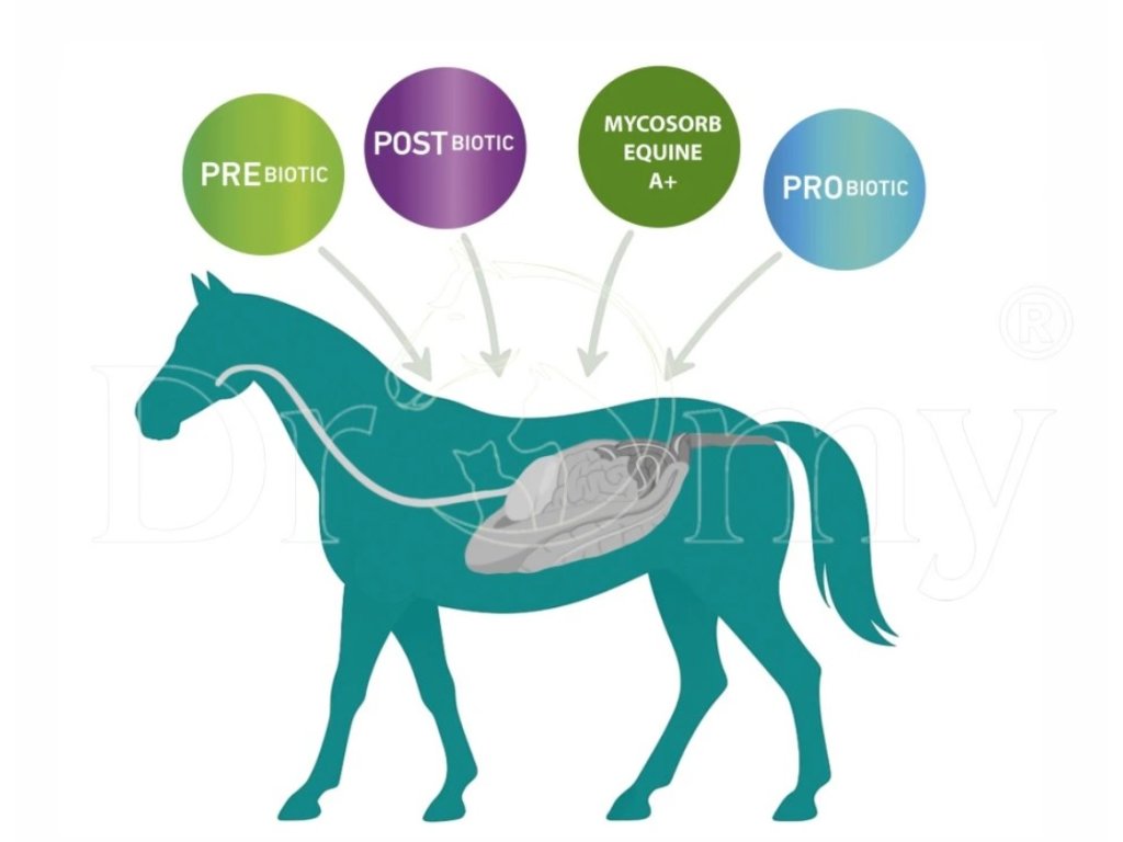 Mycosorb A+® Equine – nejnovější generace vyvazovače mykotoxinů, který působí lokálně v trávicím traktu a pracuje na principu více-místné adsorpce. Při průchodu trávicím traktem na sebe váže polární i nepolární mykotoxiny, a tím zabraňuje jejich vstřebávání do krevního oběhu. Navázané toxiny jsou bezpečně vyloučeny trusem, čímž se snižuje jejich průnik do krevního oběhu.