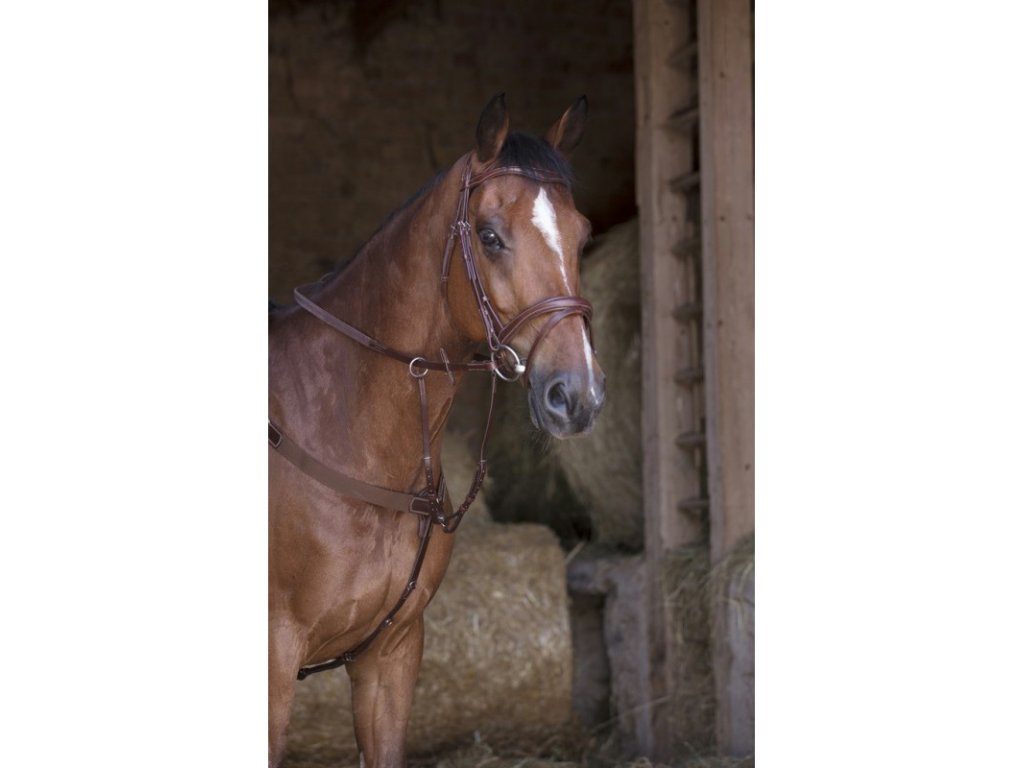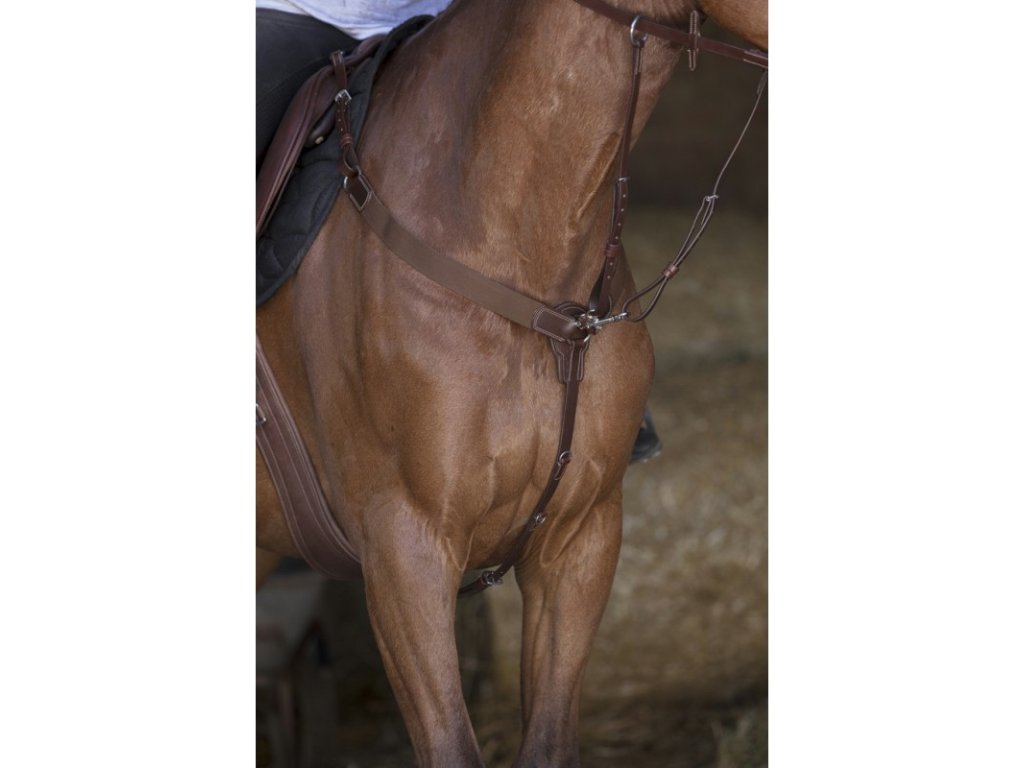 Kožený elastický poprsák , tříbodový s elastickou vsadkou a odepínací martingalovou vidlicí od značky Norton.