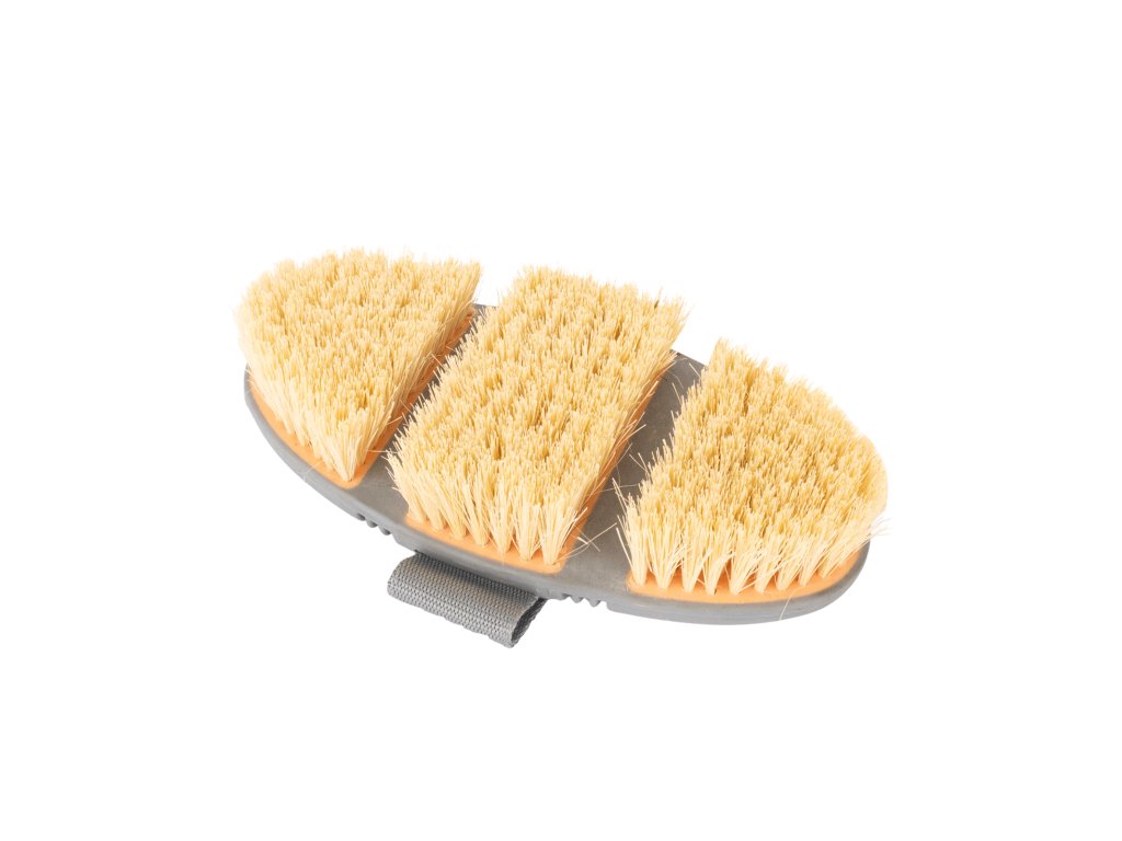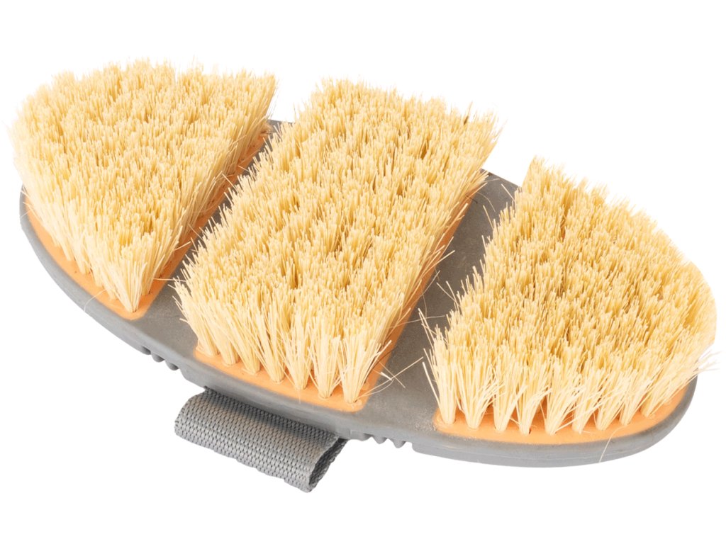 Díky robustním přírodním štětinám je ideální pro odstraňování tvrdých nečistot, jako je bláto, z celého koně.