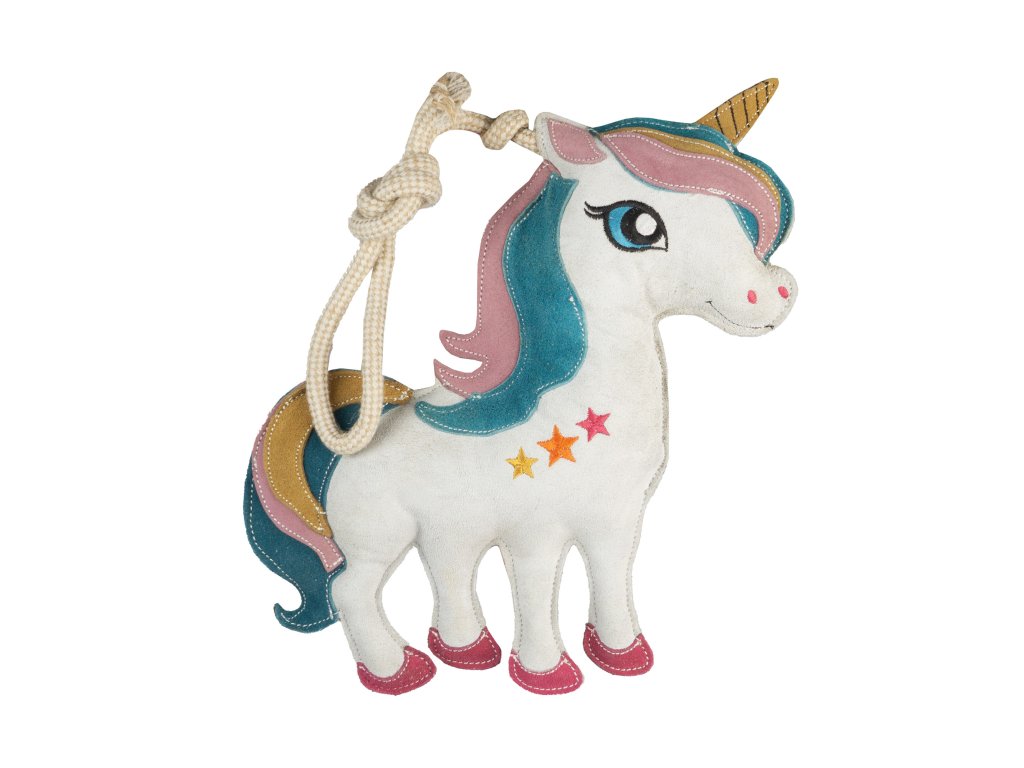 Hračka pro koně ve tvaru jednorožce vyrobená ze semišové kůže. Může sloužit k prevenci nudy a zmírnění stresu. Může být umístěna ve stáji, výběhu nebo v kamionu během přepravy.