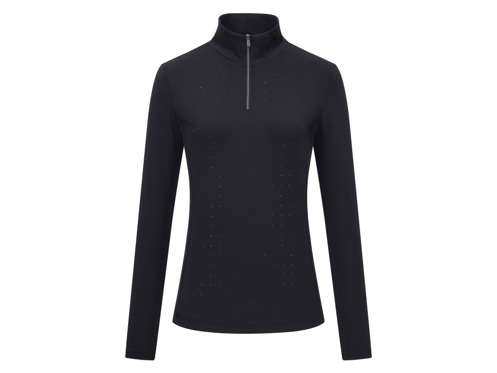 Černé závodní triko s dlouhým rukávem z lehkého a prodyšného materiálu. Elegantně zdobené jemnými kamínky a doplněné praktickým zipem u krku pro pohodlné oblékání i stylový vzhled.