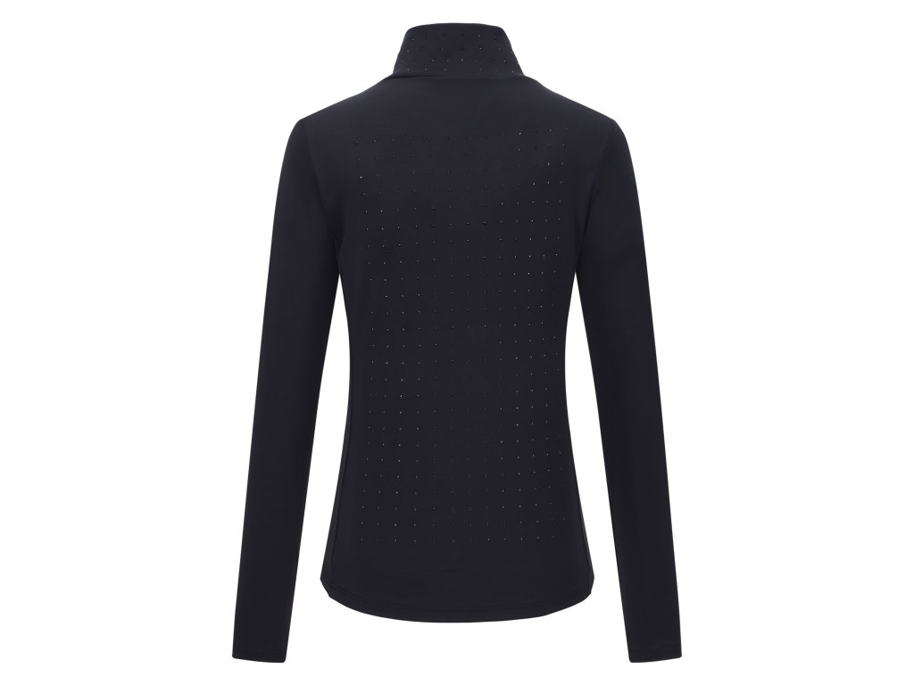 Černé závodní triko s dlouhým rukávem z lehkého a prodyšného materiálu. Elegantně zdobené jemnými kamínky a doplněné praktickým zipem u krku pro pohodlné oblékání i stylový vzhled.