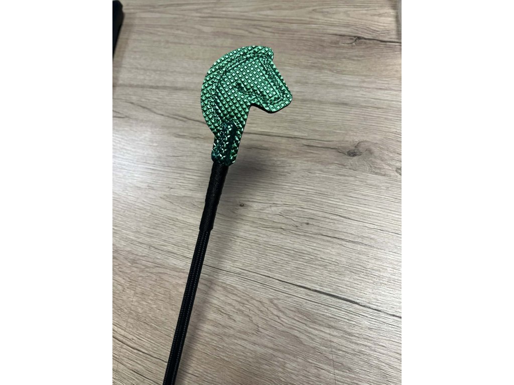 Stylový lehký jezdecký bičík s protiskluzovou, strukturovanou rukojetí ve výrazné metalické barvě zakončený tvarem koňské hlavy.