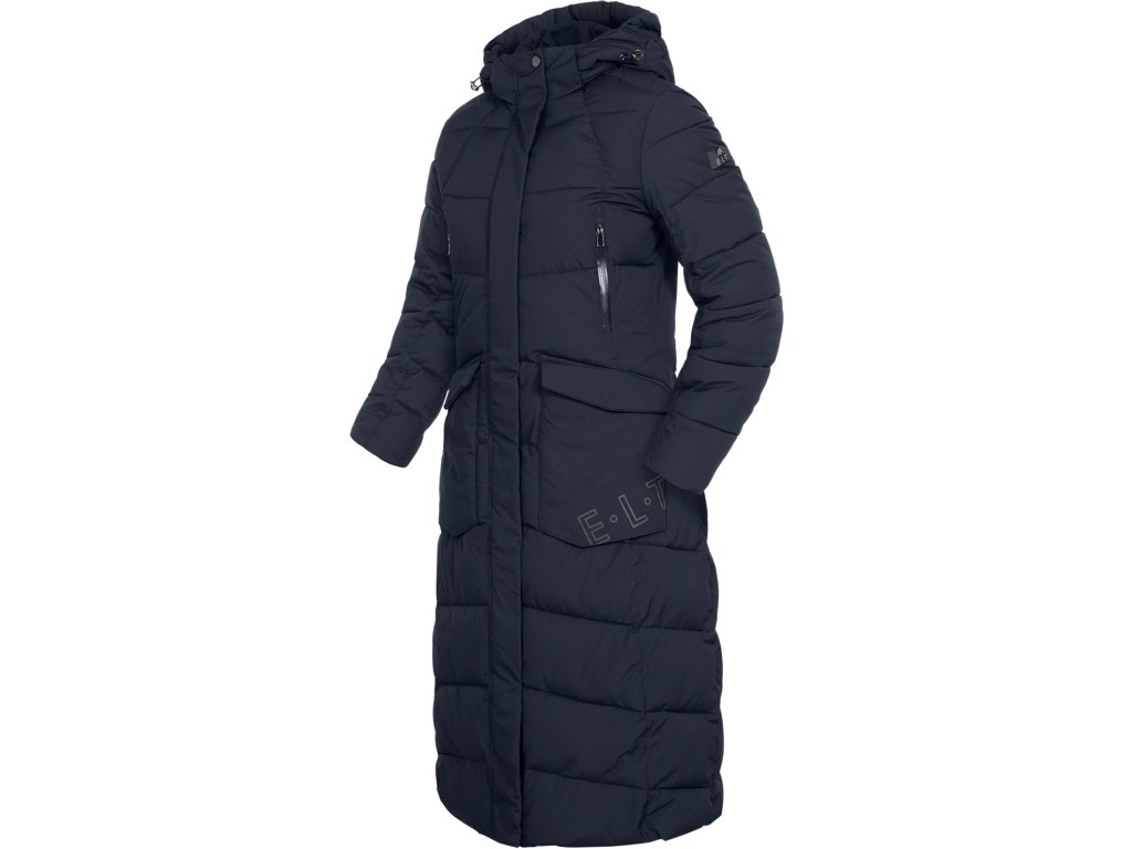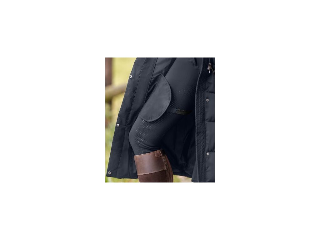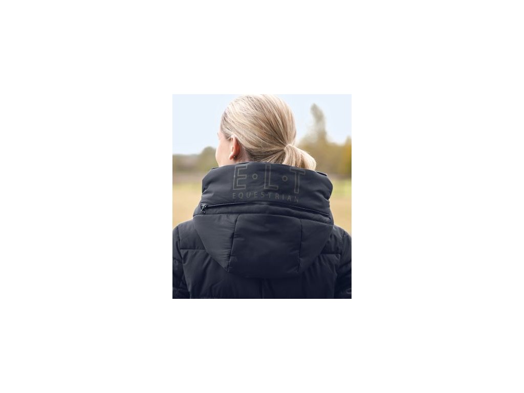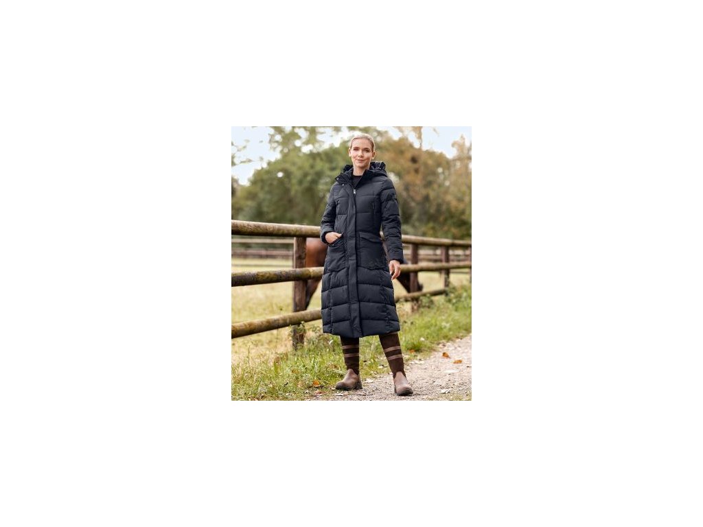 Elegantní dlouhý prošívaný jezdecký kabát s výplní připomínající peří a bohatými funkčními detaily. Prodyšný, větru a voděodolný, s odepínací kapucí, vysokým límcem, reflexními prvky a praktickými kapsami. Stylové pohodlí a spolehlivá ochrana na zimní vyjížďky.