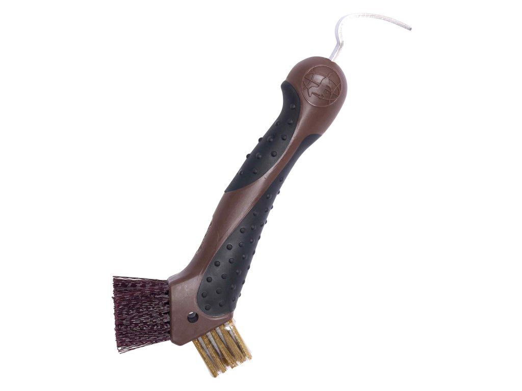 Háček na čištění kopyt s hrubými štětinami pro odstranění nečistot.