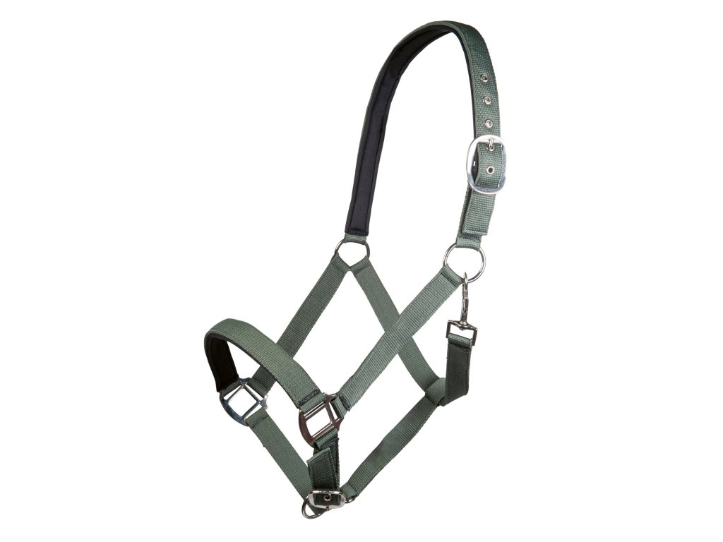 Měkce podložená ohlávka z pevného nylonu. Stříbrné pevné kování. Plynule nastavitelná.