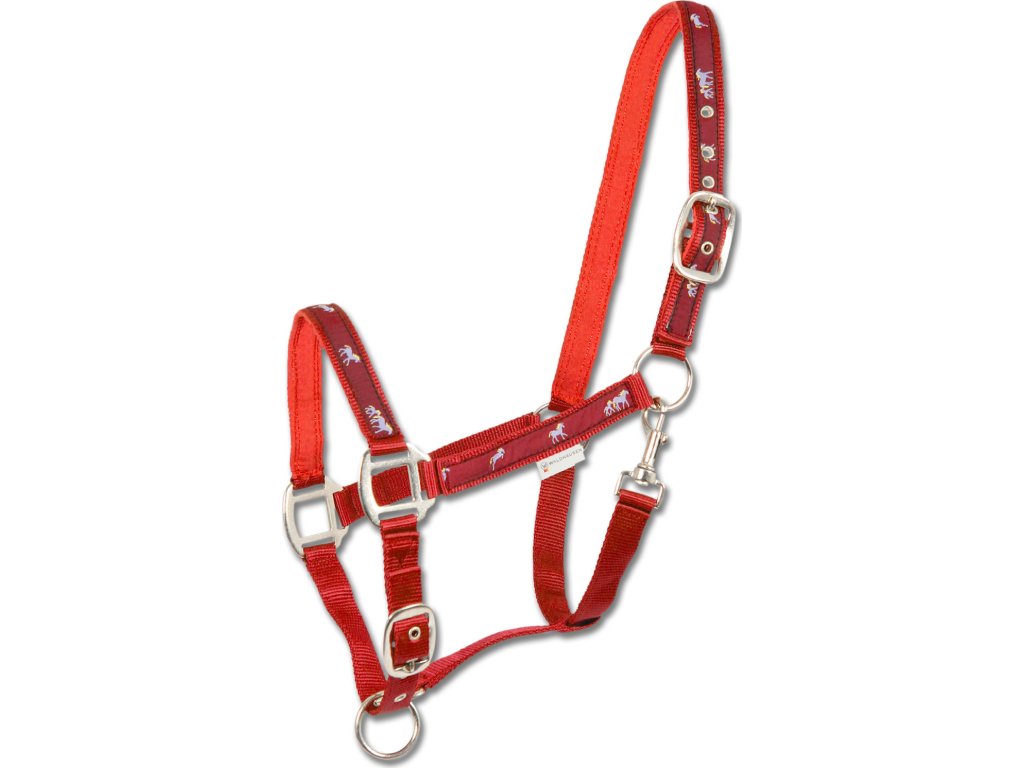 Ohlávka zdobená malými koníky. Masivní lesklé kování. Polstrování v oblasti nánosníku a nátylníku. Nastavitelná pod bradou i na nátylníku.