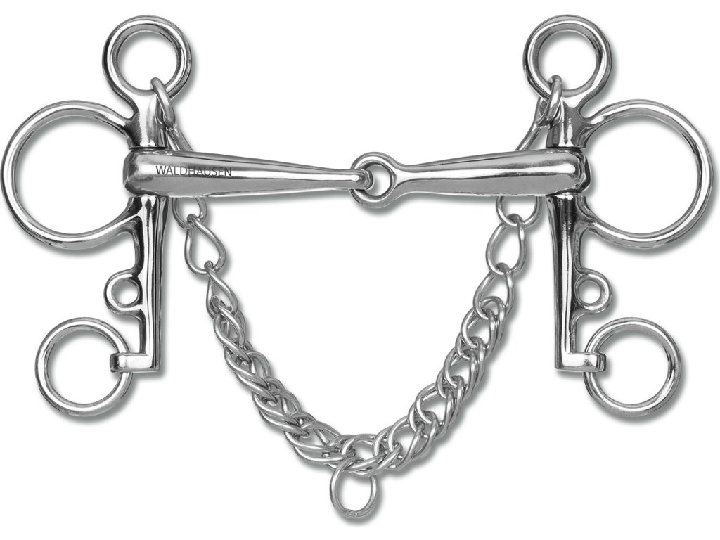 Lomené udidlo typu pelham, vyrobené z nerezové oceli.