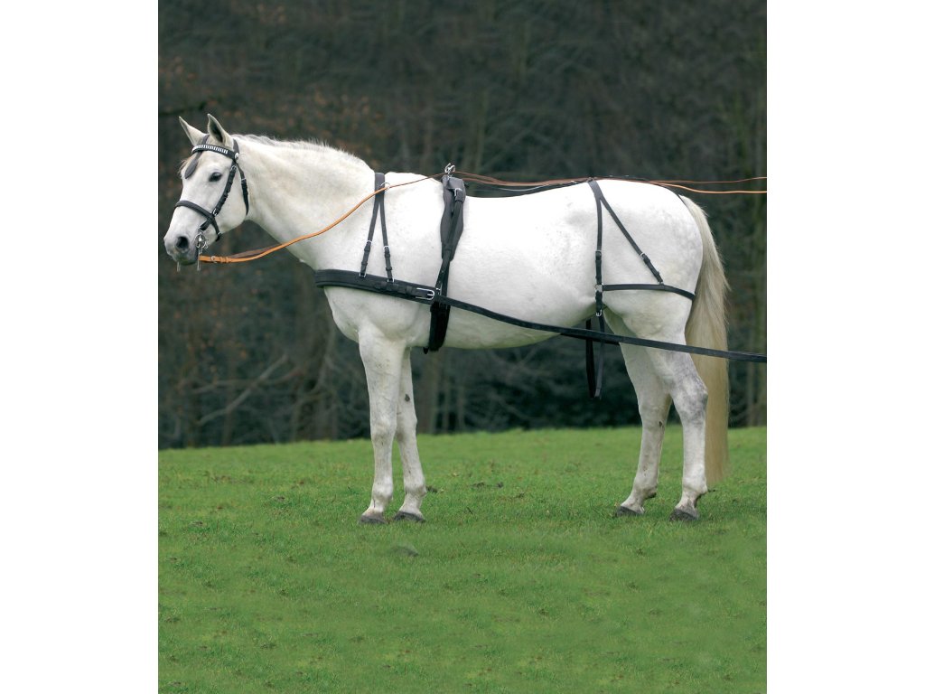 Robustní poprsní postroj pro velké koně, vyroben z pravé kůže, měkce vypodložen nylonem. Dodáván v tašce. V černém provedení. V balení je všechno kožené vybavení na fotografii, mimo udidla.