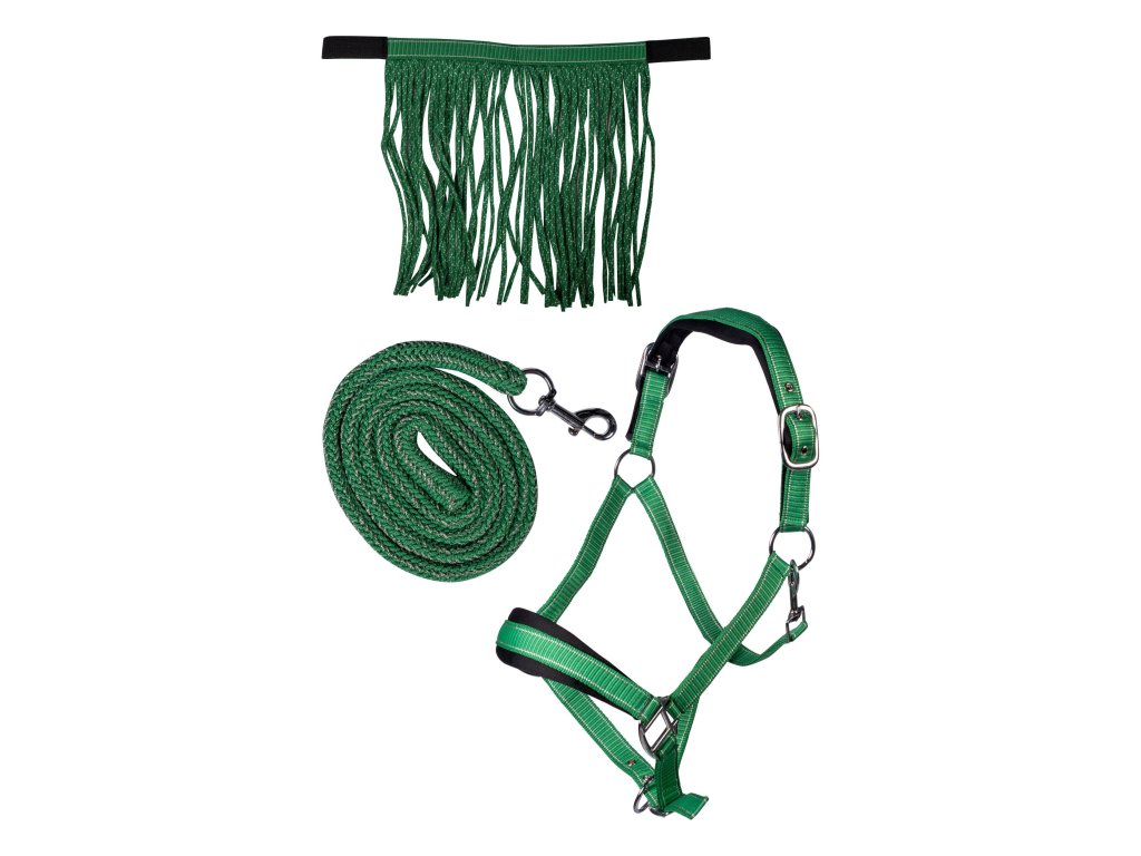 Měkce podložená ohlávka, nastavitelná na nánosníku a na obou stranách nátylníku. Set dále obsahuje vodítko a třásně proti hmyzu ve stejné barvě.