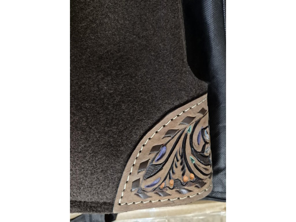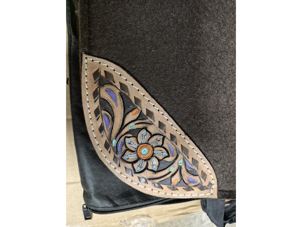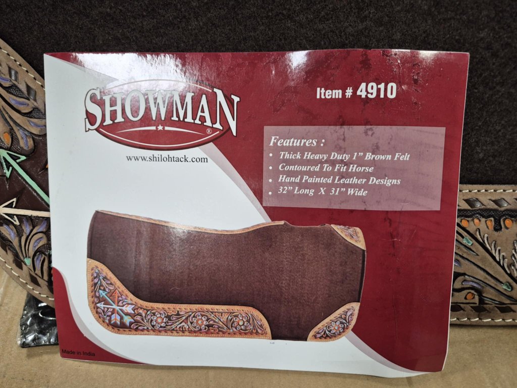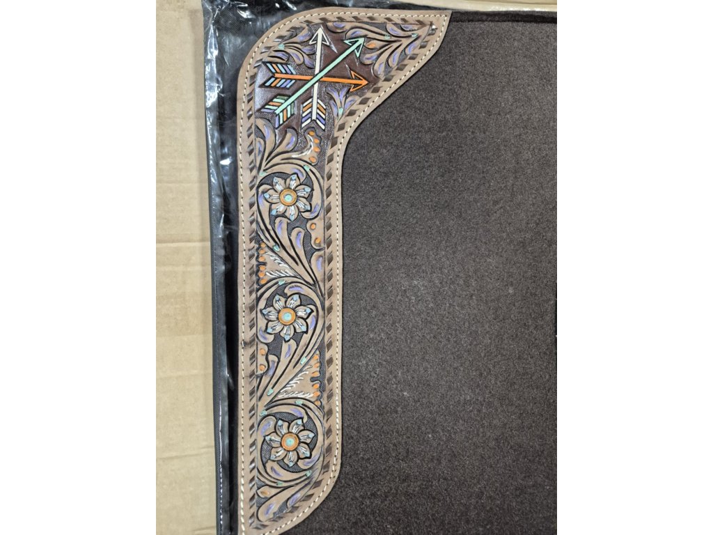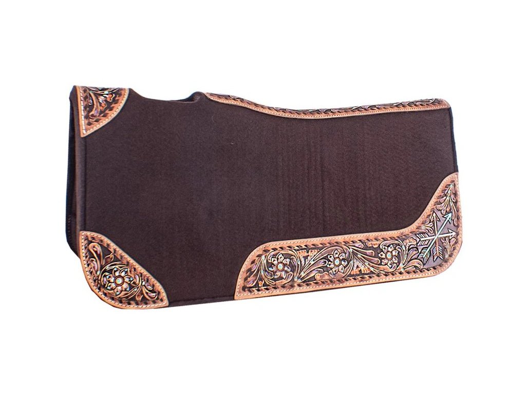 Showman 32" x 31" x 1" pad pod sedlo z plstěné látky s ručně malovaným motivem květiny a šipky. Tento pad na sedlo má 1" silnou odolnou hnědou plsť s odvzdušněným kohoutkem a kůží zesíleným hřbetem. Pad je zdoben ručně malovaným motivem květiny a šipky a lemován hnědým prošíváním.