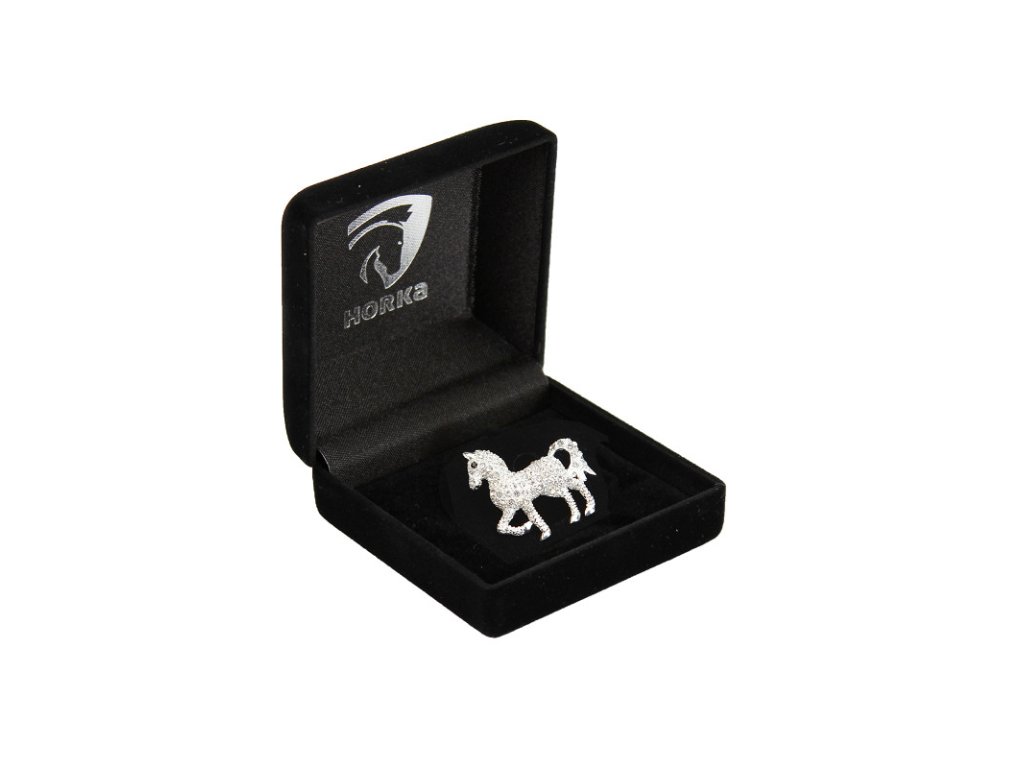 Stříbrná spona na plastron značky horka ve tvaru třpytivého koníka.
