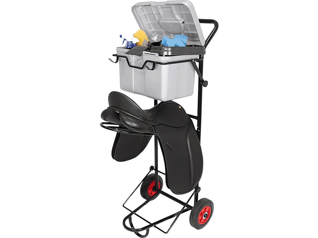 Extra pevný a stabilní vozík s držákem na sedlo, 2 háčky na uzdu nebo ohlávku a fixačním zařízením, které zabrání tažení uzdečky po zemi. Úložný prostor pro příslušenství.
