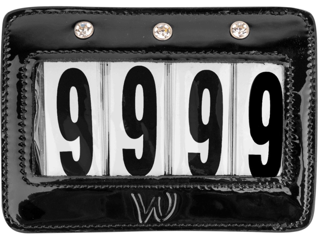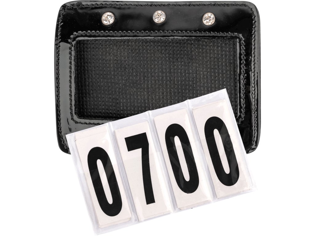 Soutěžní čísla vyrobená z měkké lakované kůže s krásnými kamínky. Snadná výměna soutěžních čísel. Nastavitelná od 1 do 9999. Snadno se připevňují k podsedlové podložce pomocí velkého zavíracího špendlíku. Pár. Rozměry: 11 x 8 cm.