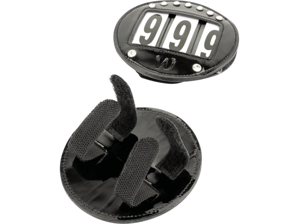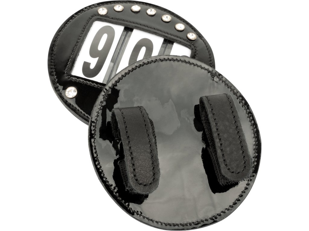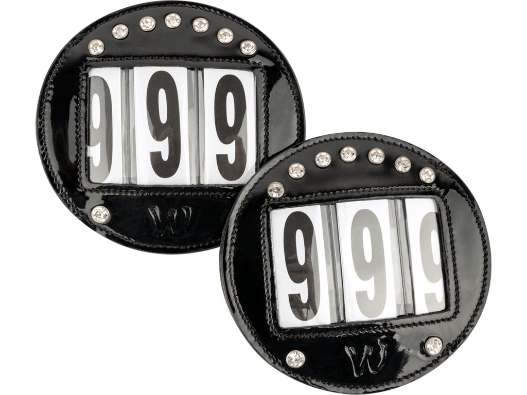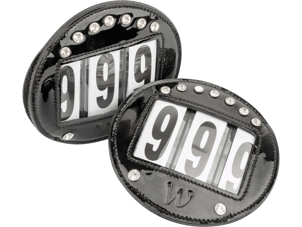 Startovní čísla na uzdečku z měkké lakované kůže s krásnými kamínky. Snadná výměna soutěžních čísel. Nastavitelná od 1 do 999. Snadné připevnění k uzdě pomocí dvou suchých zipů. Pár. Rozměry: kulatý Ø cca 9,5 cm.