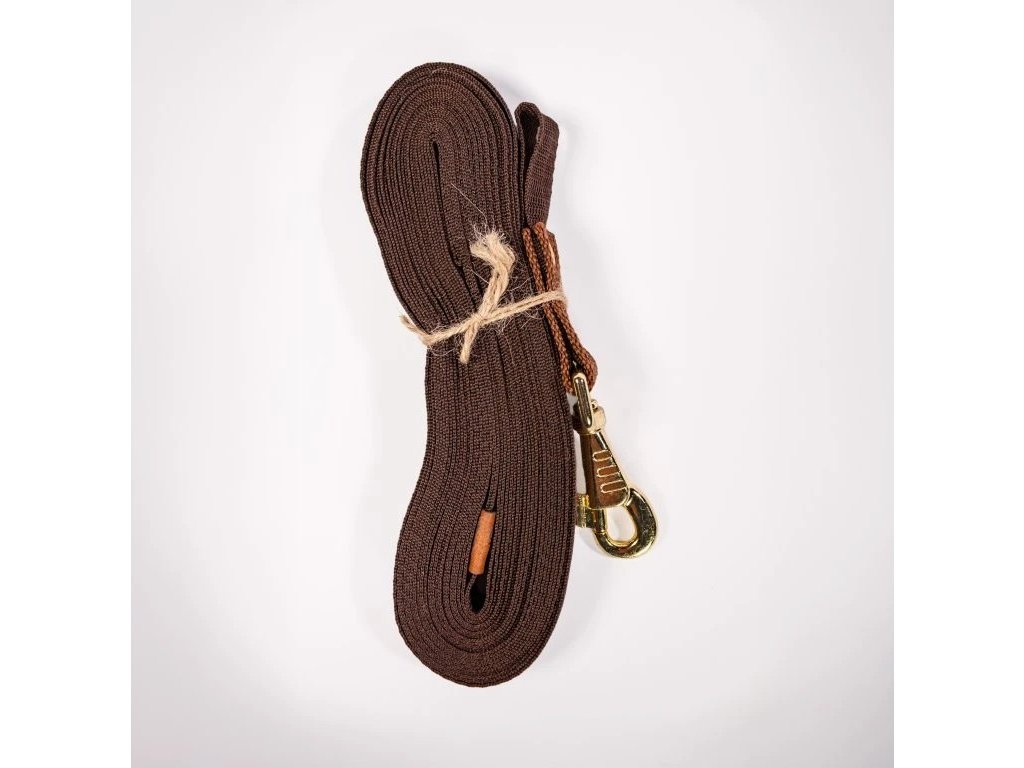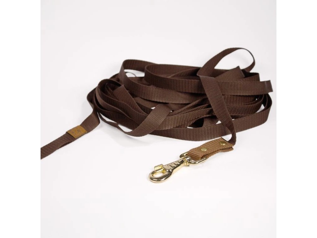 Hnědé stopovací vodítko se zlatými a koženými prvky.