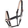 Elegantní kožená ohlávka s podloženým nánosníkem a nátylníkem. Vysoce kvalitní růžové kování. Oboustranně nastavitelný nátylník, nastavitelný podbradní pásek.