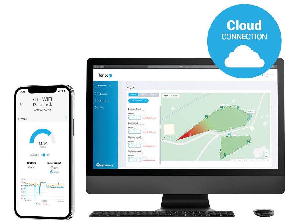 Chytrý Wi-Fi generátor EDW stačí jednoduše připojit přímo na router 2,4 GHz. Generátor odesílá získaná data přímo do cloudu, který je shromažďuje a směruje do mobilního telefonu. Cloudové řešení umožňuje vzdálené ovládání a kontrolu ohradníku odkudkoliv bezplatnou aplikací fencee Cloud. Tu lze použít také na tabletu nebo v prohlížeči na PC. Neomezené ovládání. Bez dalších nákladů. Zabezpečení bezdrátové sítě WPA2 – PSK / WEP.
