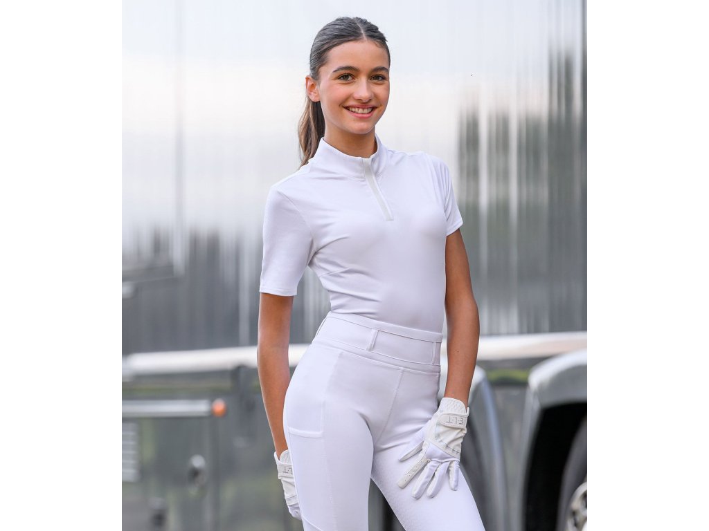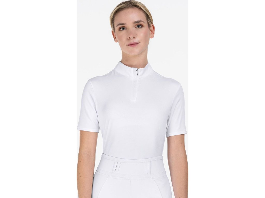 Jednoduché závodní tričko se stojáčkem a velmi decentním zdobením nad zipem. Tričko je velmi dobře prodyšné, má přiléhavý střih. Zapínání je schováno pod ozdobným lemem. V zadní části límce je očko s poutkem.