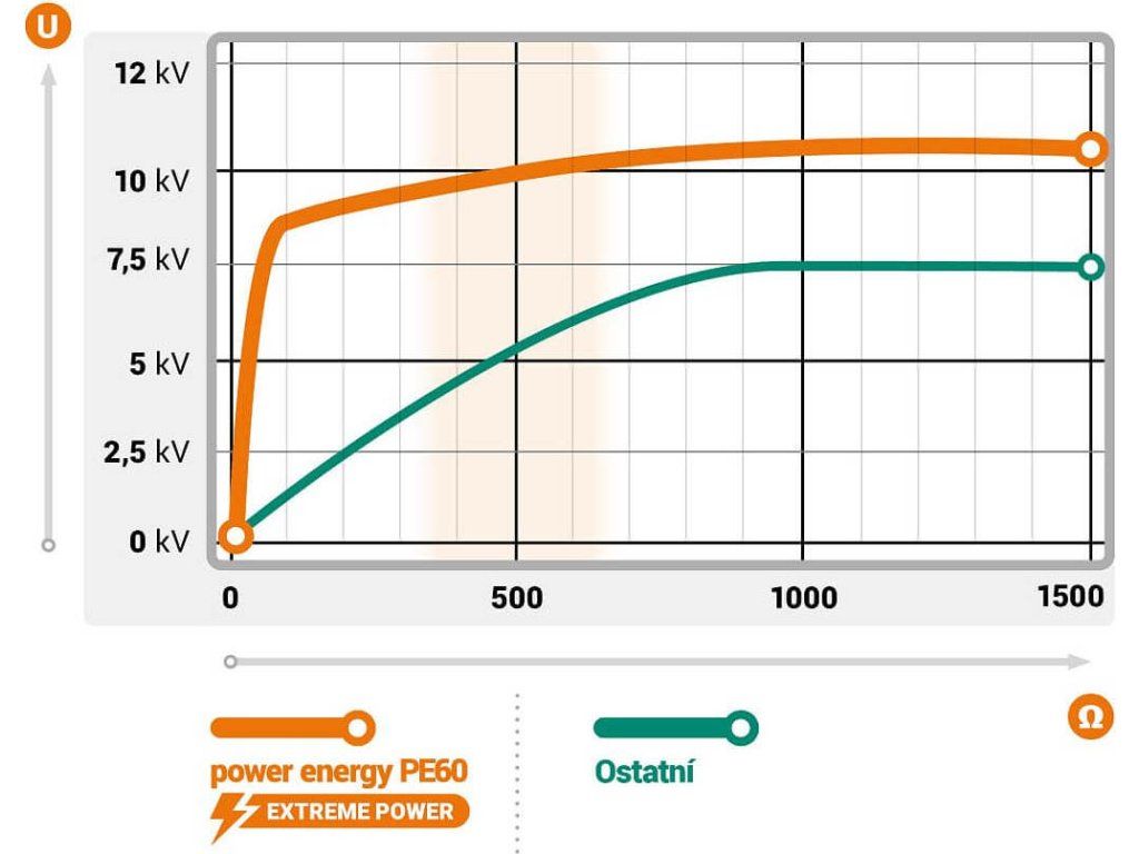 Generátor power energy PE60 je vhodný pro ohrady prorostlé vegetací, kde díky mimořádně silnému transformátoru dokáže zajistit maximální účinnost ohradníku odpovídající generátorům s výkonem až 15 J. Garance dostatečně vysokého napětí i při intenzivním zatížení trávou prorostlé elektrické ohrady. Dlouhodobá ochrana.