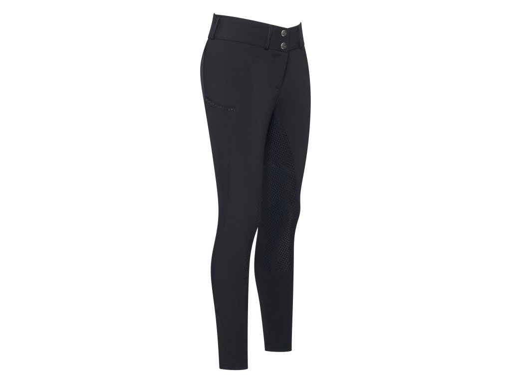 Stylové černé rajtky určené pro chladnější dny kombinují funkčnost s elegancí. Jsou vybaveny fullgrip sedem pro maximální jistotu a pohodlí v sedle. Na bocích se nacházejí praktické kapsy, zdobené jemnými kamínky, které dodávají decentní třpyt. Na zadní straně pak najdete dvě ozdobné kapsy, zvýrazněné elegantním knoflíčkem, které podtrhují moderní vzhled.