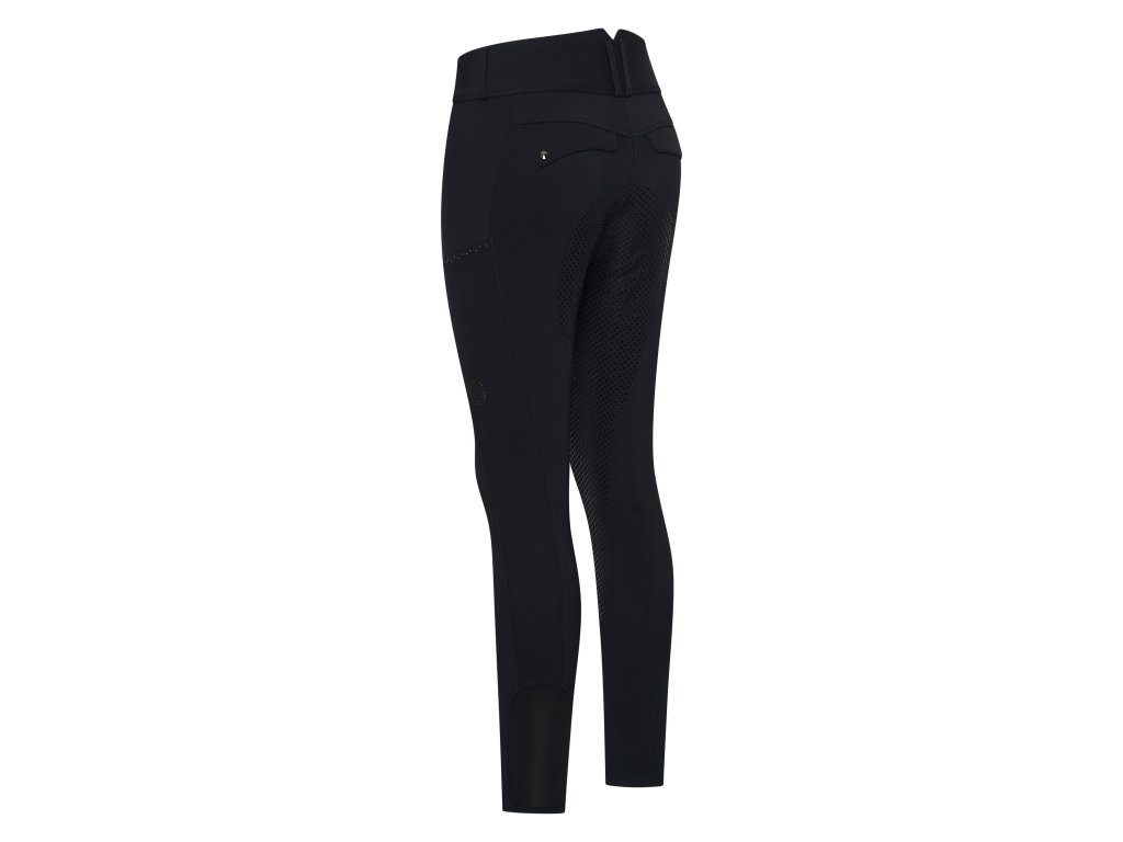 Stylové černé rajtky určené pro chladnější dny kombinují funkčnost s elegancí. Jsou vybaveny fullgrip sedem pro maximální jistotu a pohodlí v sedle. Na bocích se nacházejí praktické kapsy, zdobené jemnými kamínky, které dodávají decentní třpyt. Na zadní straně pak najdete dvě ozdobné kapsy, zvýrazněné elegantním knoflíčkem, které podtrhují moderní vzhled.
